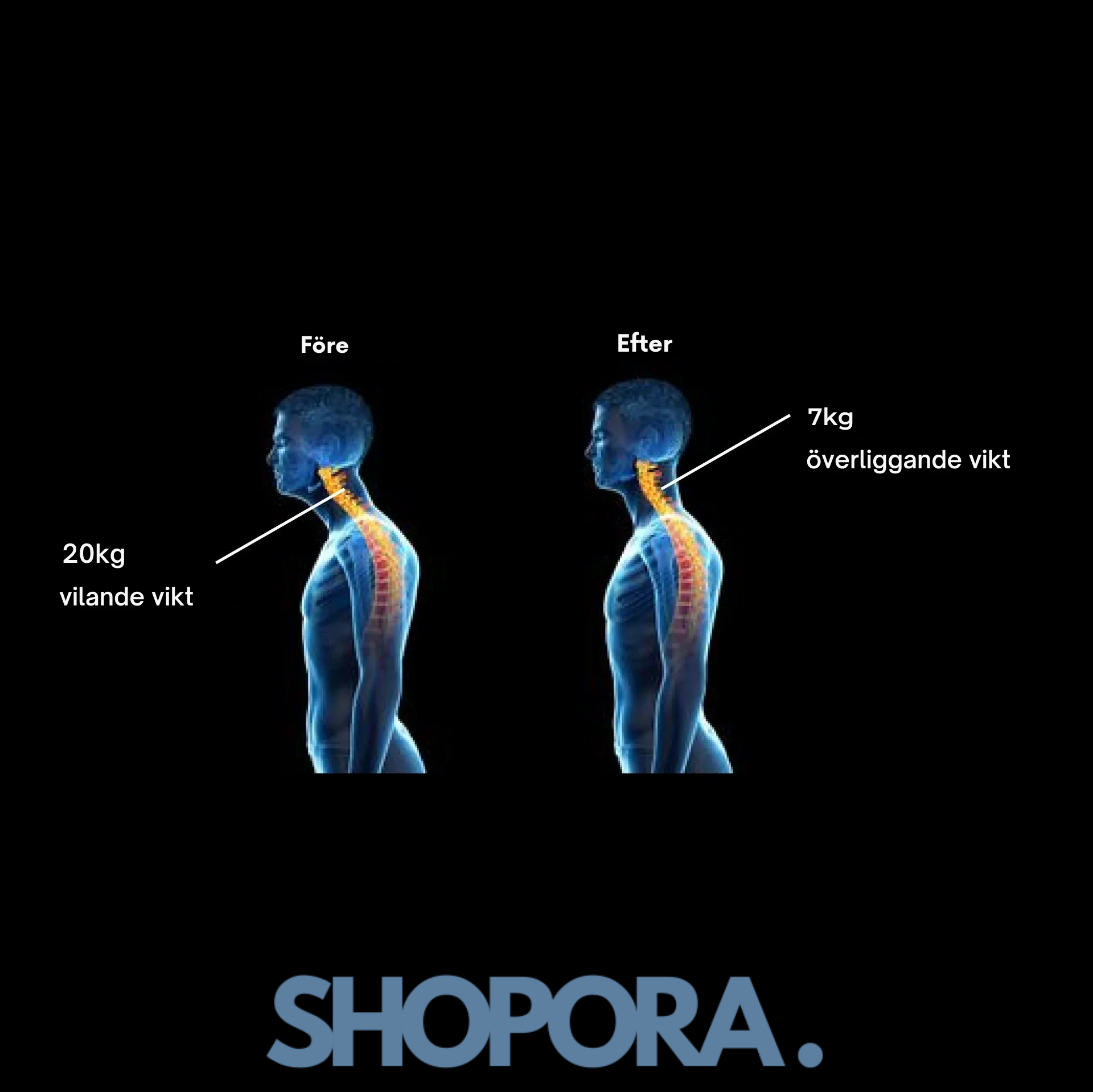 - Stretching: Sträcker nacken i den optimala vinkeln på 26° (cervikal traktion), vilket minskar trycket på ryggraden och återställer den naturliga kurvaturen.