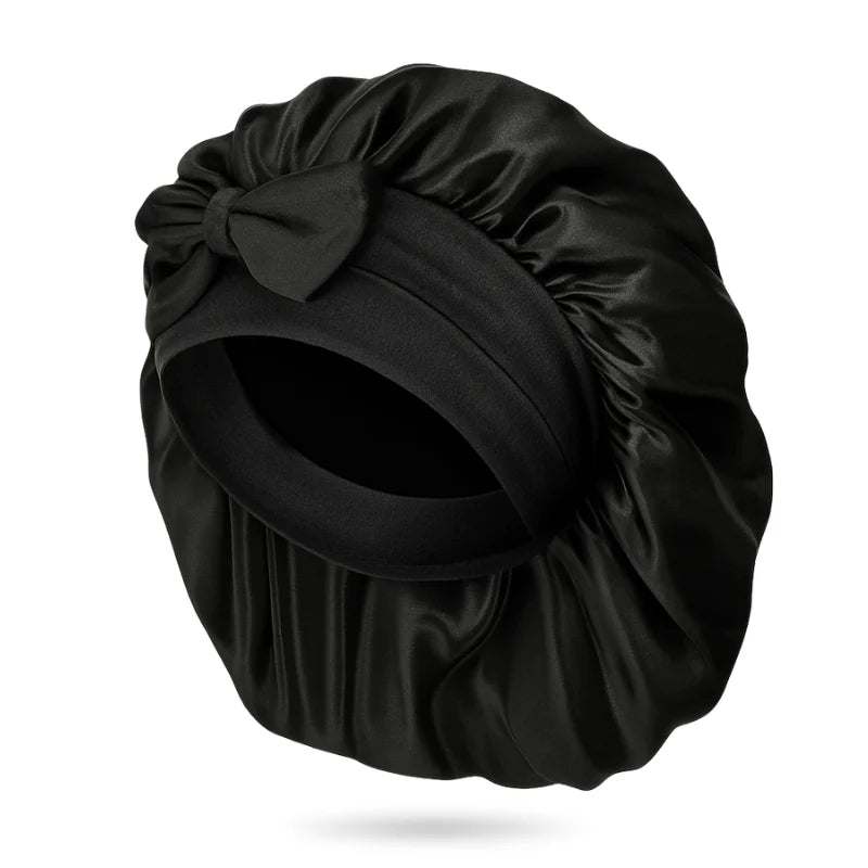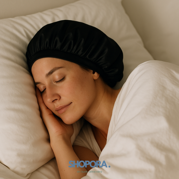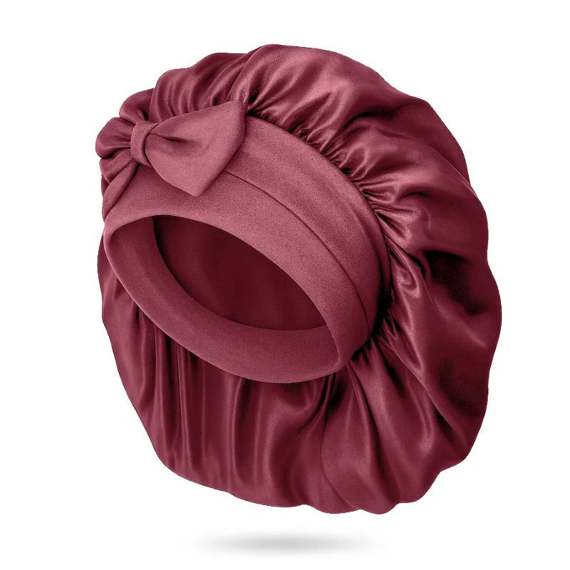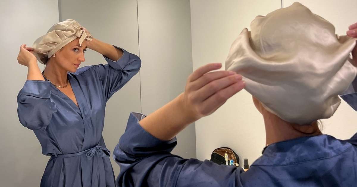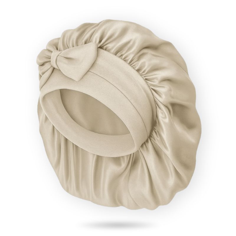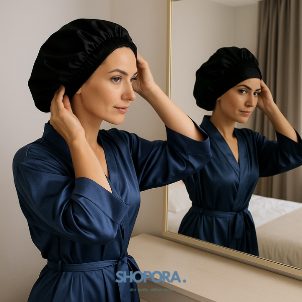 En silkesbonnet täcker hela huvudet och skyddar allt hår från friktion och fuktförlust.